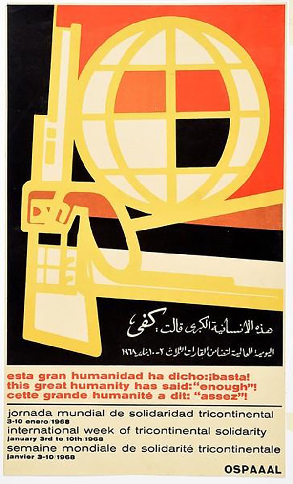 On January 3, 1966, 513 delegates representing 83 groups from countries across Latin America, Asia, and Africa gathered in Havana, Cuba for the first Tricontinental Conference. The meeting was organized by Moroccan politician Mehdi Ben Barka who was killed in 1965 before the conference took place. In attendance were two anti-imperialist and anti-capitalist groups, the Non-Aligned Movement—an organization of countries not associated with any power blocs—and the Afro-Asian People’s Solidarity Organization, which promoted unity between countries formally under imperialism. By the end of the conference the two had joined to form the Organization of Solidarity with the Peoples of Africa, Asia, and Latin America, more commonly known in Spanish as Organización de Solidaridad con los Pueblos de Asia, África y América Latina (OSPAAAL).