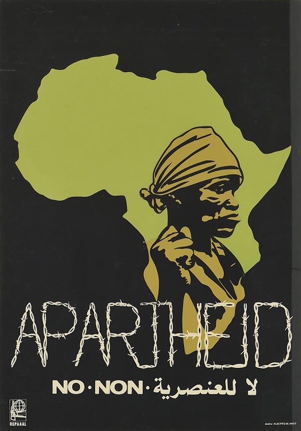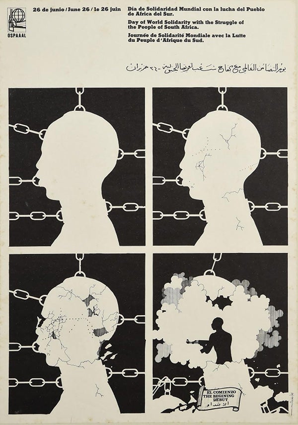 In fact, the multilingual distribution of OSPAAAL’s messaging was a key part of their strategy in building a global solidarity movement. The Tricontinental magazine and official posters developed by the organization often contained text in Spanish, French, Arabic, and English. One of these posters titled “Day of World Solidarity within the Struggle of the People of South Africa” represents the destruction of apartheid by depicting a person being pulled apart until another figure, drawn in black, arrives with a gun. This image could be seen as a direct visual metaphor for the way a global Black diaspora might come to the defense of Black South Africans. While the universality of this poster could be seen through the use of four languages, the illustrations themselves also sent a message—destroy oppressive systems—that could inspire people across the Tricontinental.