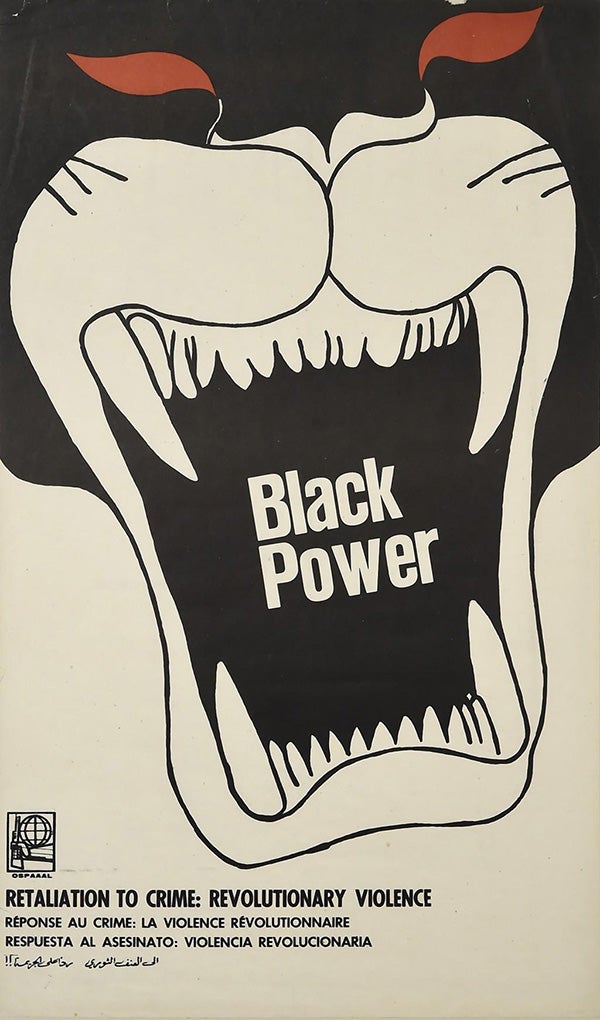 OSPAAAL also created posters for oppressed groups of people who could not attend the conference, including Palestinians. These posters were initially distributed to people who received the Tricontinental magazine. OSPAAAL made posters on behalf of and support the Black Panther Party (BPP), which, like OSPAAAL, the U.S. government viewed as a threat. In 1968, two years after the BPP was founded. OSPAAAL distributed a poster with the text “Black Power” in English on top of an illustration of a black panther, and with the text at the bottom, that read “Retaliation to Crime: Revolutionary Violence.” Similar to their posters for African countries, posters like this one encouraged oppressed Black Americans to lead a revolt against their neo-colonialist government in the United States.