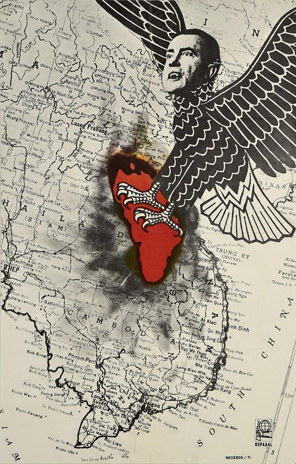 While many of the OSPAAAL posters were dedicated to the struggles of oppressed people throughout the world, this 1968 poster focused on the unity between Tricontinentalists who wanted to radically change the imperialist influence specifically in the Global South. The juxtaposition of OSPAAAL’s motto “This great humanity said: enough,” with a gun next to a globe conveyed the message that violence was necessary to overthrow imperialist, capitalist world powers like the United States. Moreover, as dismantling American imperialism was a resolution of the Tricontinental Conference, Cuba created posters which characterized its leaders as predators. This 1971 poster features an image of former U.S. President Richard Nixon as a bird of prey “tearing the heart out of Indochina.”