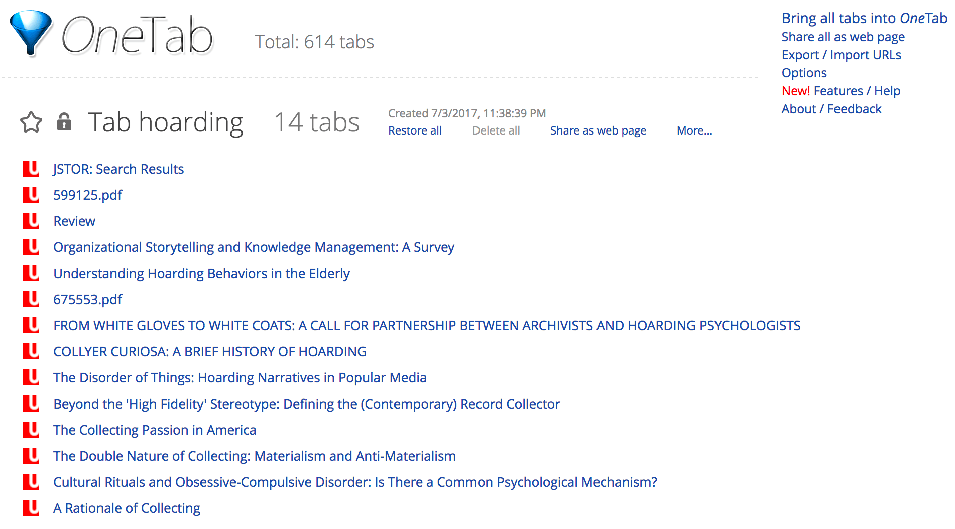 Lee and Capra’s typology makes me see that my obsession with OneTab lies in its near-miraculous ability to span the multiple ways in which I use browsers tabs for both personal information management and personal information management. While that flexibility is what leads us to spend so much of our lives inside our web browsers (OMG! I can find web-based services for everything!), it is also what leads so many of us into the dilemma of browser tab overload (OMG! I have used web-based services for everything, and now I have everything on the entire internet open in my browser!) OneTab makes it possible to be the kind of tab hoarder who opens tabs for everything — while still being able to keep, find, and organize all those tabs.