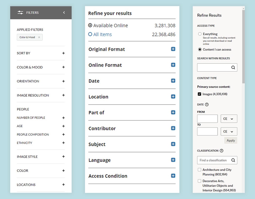 The best approach to browsing is to remember that images are always part of bigger groups of objects that have shared features, whether that’s similar metadata or being part of organized collections. To get the most out of browsing an online image resource, it can be helpful to think of the process as similar to wandering a museum: rather than making a bee-line for a specific work of art, you’re more likely going to explore galleries organized by geography, period, material, or even color.