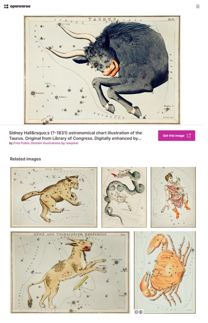 After browsing by collection or using filters to explore an entire image library, many image resources online will recommend items related to ones you’ve recently selected. The Library of Congress, for example, lists “More items like this” and “Images you may also like” below each selected image. Openverse and JSTOR Images provide the same opportunity to browse in a “Related” section following an image and its metadata.