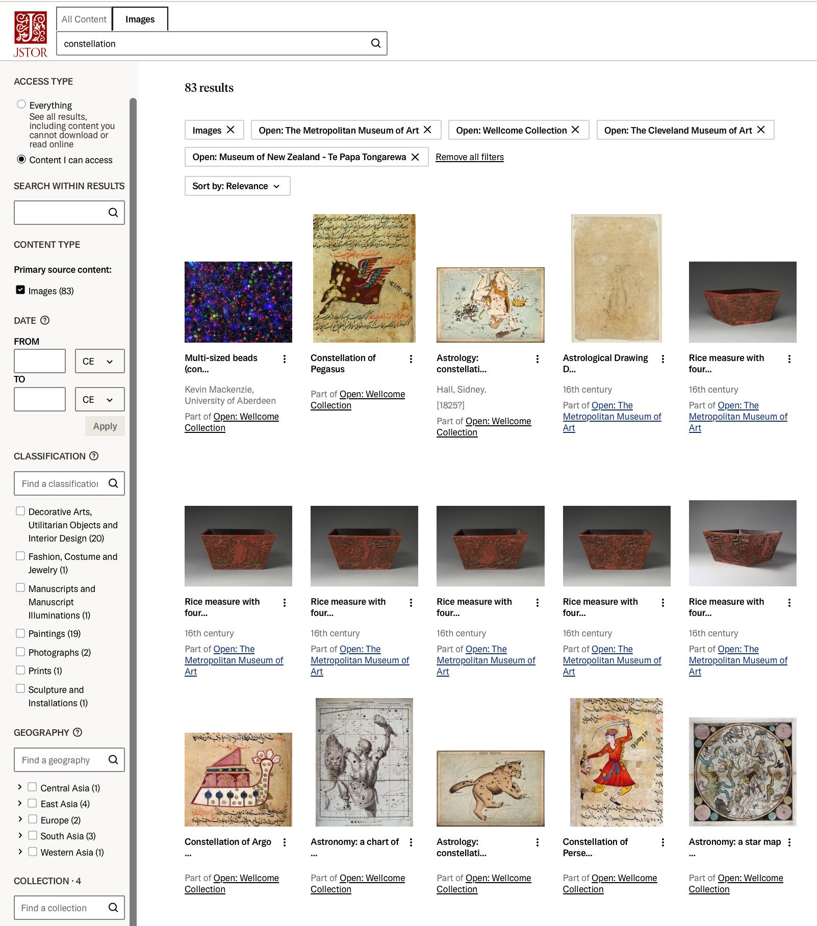 Try clicking the search button without typing in any search terms—on sites like Getty Images and Flickr, this brings up a menu of filters ranging from date and color to content and license type. Most platforms will let you search a wildcard, often an asterisk (*), to generate a list of all items in the database with the option to add filters later. On JSTOR Images, you can start a filter-only search by selecting an initial filter such as classification or geography.