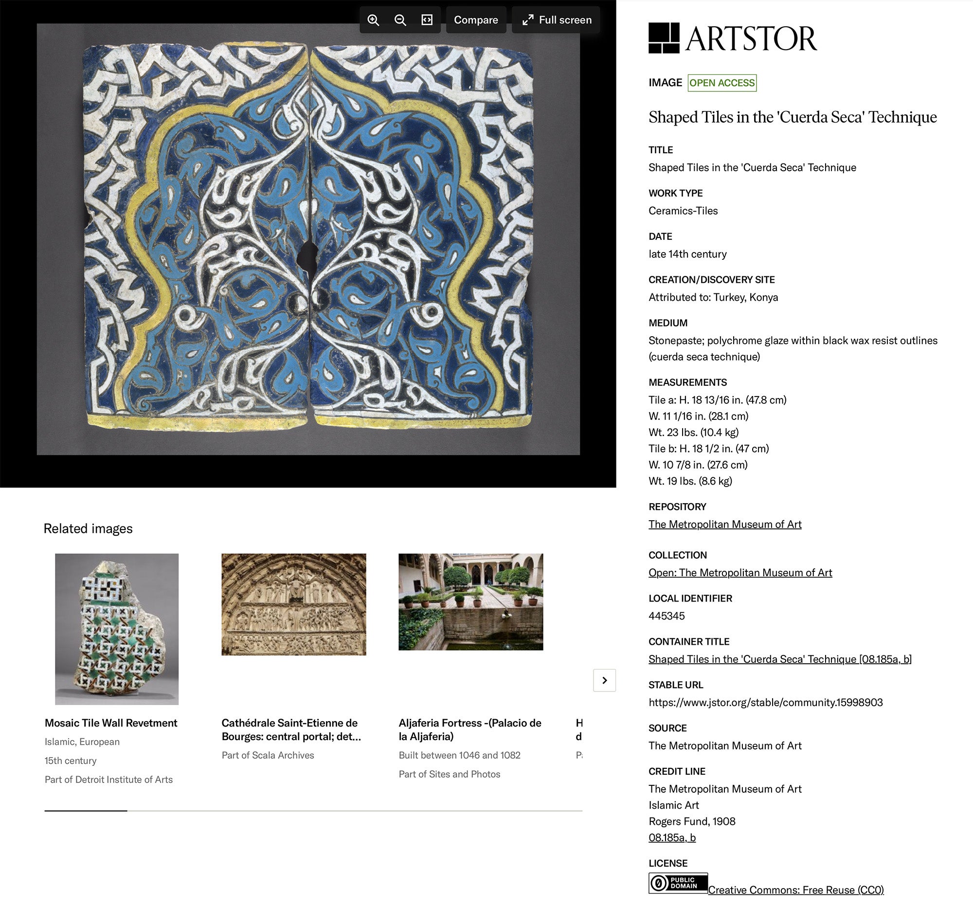 After browsing by collection or using filters to explore an entire image library, many image resources online will recommend items related to ones you’ve recently selected. The Library of Congress, for example, lists “More items like this” and “Images you may also like” below each selected image. Openverse and JSTOR Images provide the same opportunity to browse in a “Related” section following an image and its metadata.