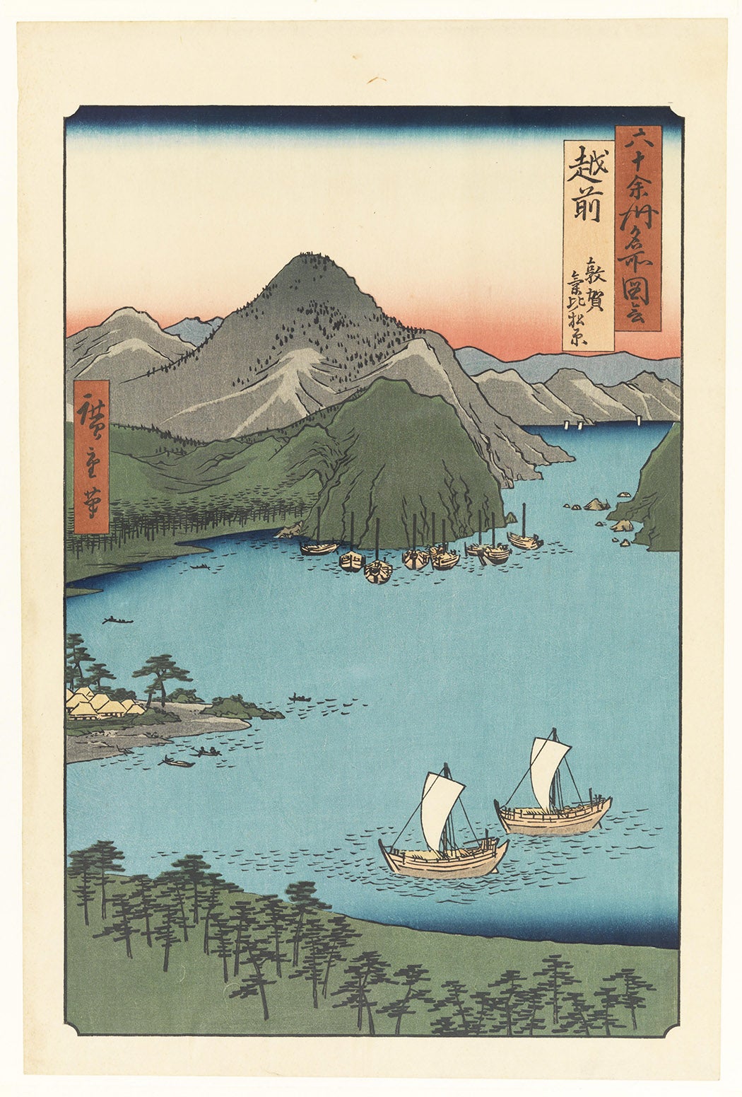 Hiroshige himself traveled from Edo to Kyoto in 1832, sketching the sights as he went, so many of the scenes in Fifty-three Stages are based on his own observations. For other travel series, such as his Famous Views of the Sixty-Odd Provinces, he looked to early nineteenth-century guidebooks. The subsequent designs, including his interpretation of the Kehi pine tree grove in Tsuruga, Echizen Province, are organized according to the highway that runs through each province.