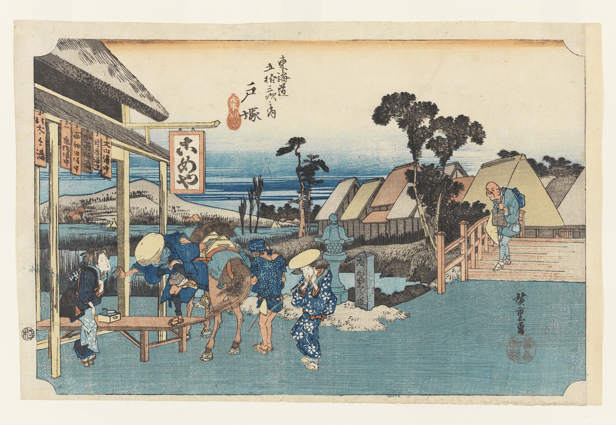 Exemplary of Hiroshige’s travel art is the well-known Fifty-three Stages of the Tōkaidō Road (c. 1833), a set of prints showcasing the fifty-three post stations along the road between Kyoto and Edo. His depiction of the fifth station, Totsuka, which foregrounds a traveler arriving at a teahouse at Motomachi Fork, is typical of the series.
