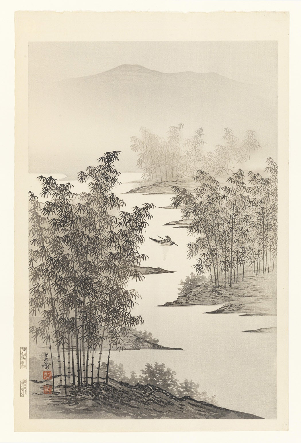 The bamboo trees and misted landscapes in the work of Imoto Tekiho are appropriately ethereal and mysterious. Little is known about Imoto, other than his birth year (1909) and that he studied in Kyoto under Inshō Dōmoto, a landscape artist who explored Chinese traditions in addition to Japanese and Western abstract art.