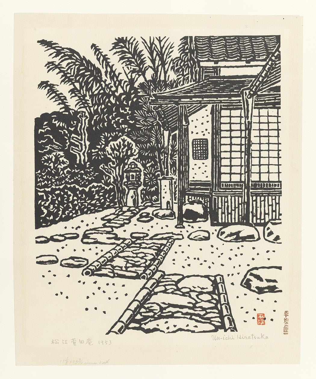 Hiratsuka’s view of a shrine garden, completed in 1953, highlights his bold carving style—he often rocked a square-end chisel to create rough, deep lines—and stark, monochromatic palette.