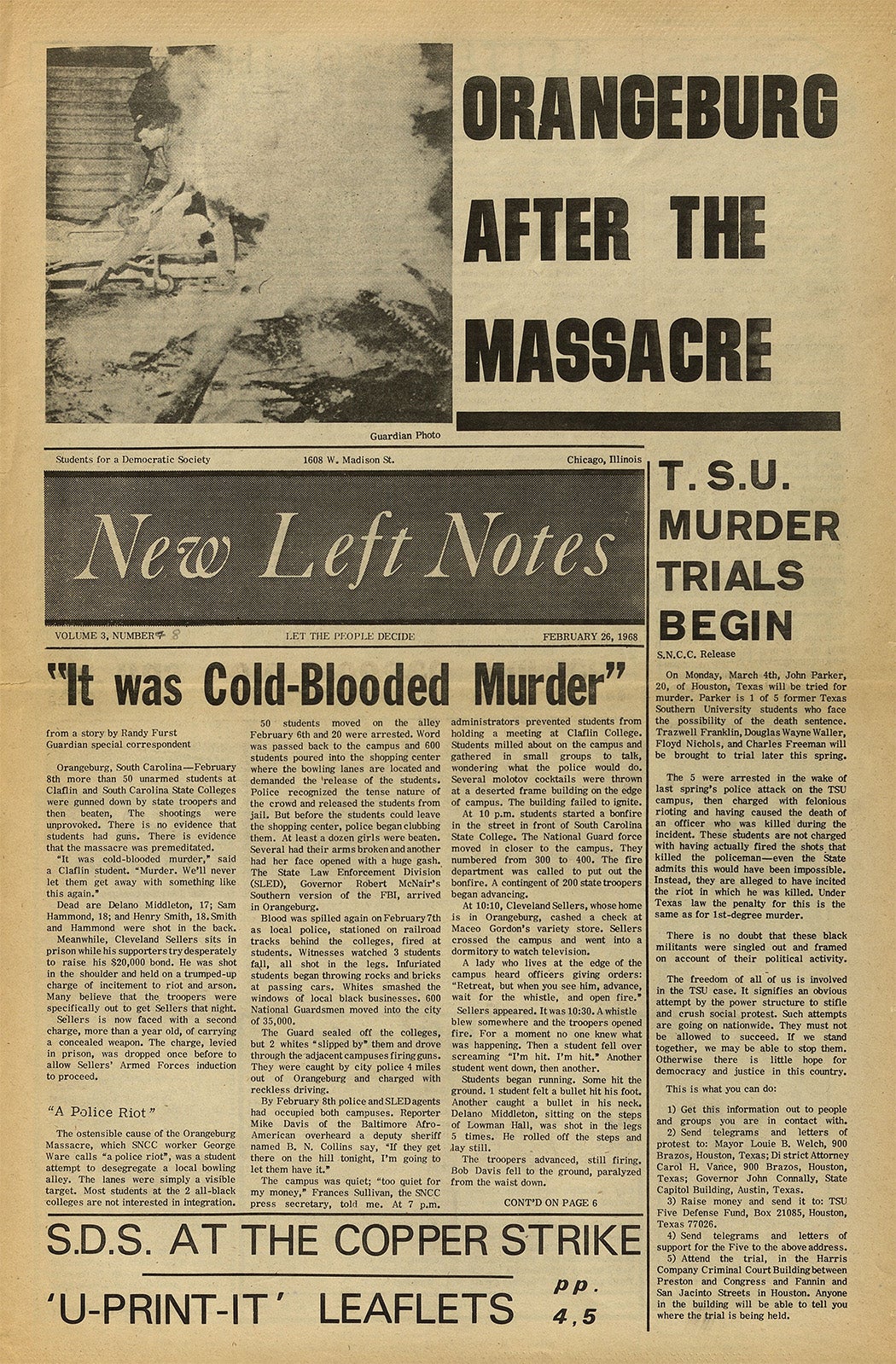 In 1968, students from South Carolina State College, a historically Black college in Orangeburg, attempted to enter a segregated bowling alley in town. The alley was closed by police for the night. The students returned the next day, finding the doors locked and guarded by police. When the doors opened to let one of the officers in, students rushed in, resulting in fifteen arrests. As news of the arrests spread, a crowd began to form outside of the alley. (More contemporary reporting can be found in Reveal Digital’s open access Campus Underground newspaper collection on JSTOR.)