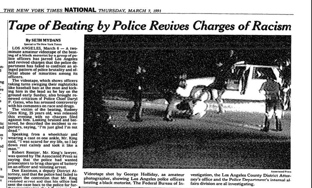 Solomon writes that the initial stories about the assault on King on March 3, 1991, focused on the response by community and civil rights groups. They pointed to the beating as an example of persistent racism and brutality in the LAPD. The Times quoted a legal advocacy group that noted it received complaints similar to what King had suffered on a regular basis, as well as a criminal justice professor who described police as “blatantly and openly hostile to nonwhite minorities.” The papers also covered local leaders’ calls for Police Chief Daryl F. Gates to resign.