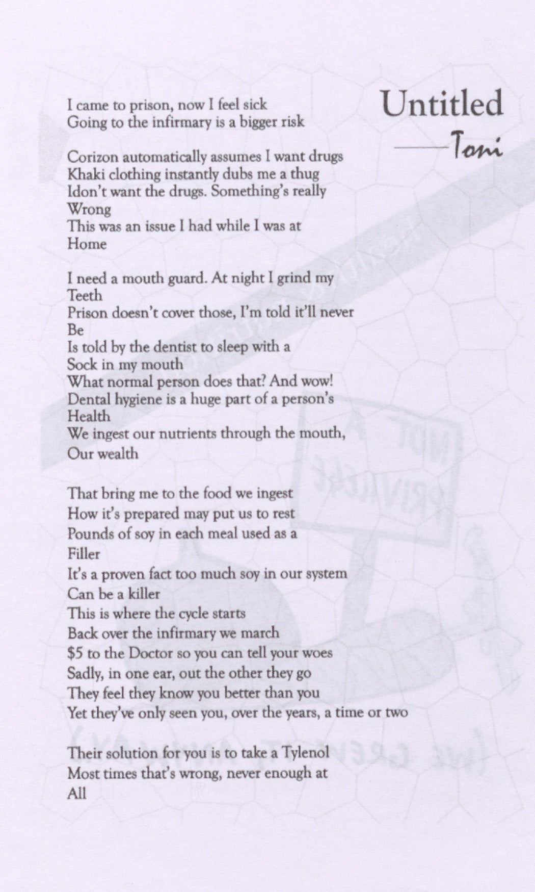 The untitled poem by Toni makes a clear link between the food she is served and her health problems. She is frustrated by the fact the dentist refuses to give her a mouth guard and instead told her to put a sock in her mouth. Farfetched as it may sound, people in prison are routinely denied dental devices such as dentures, even when their lack causes legitimate dietary and health complications.