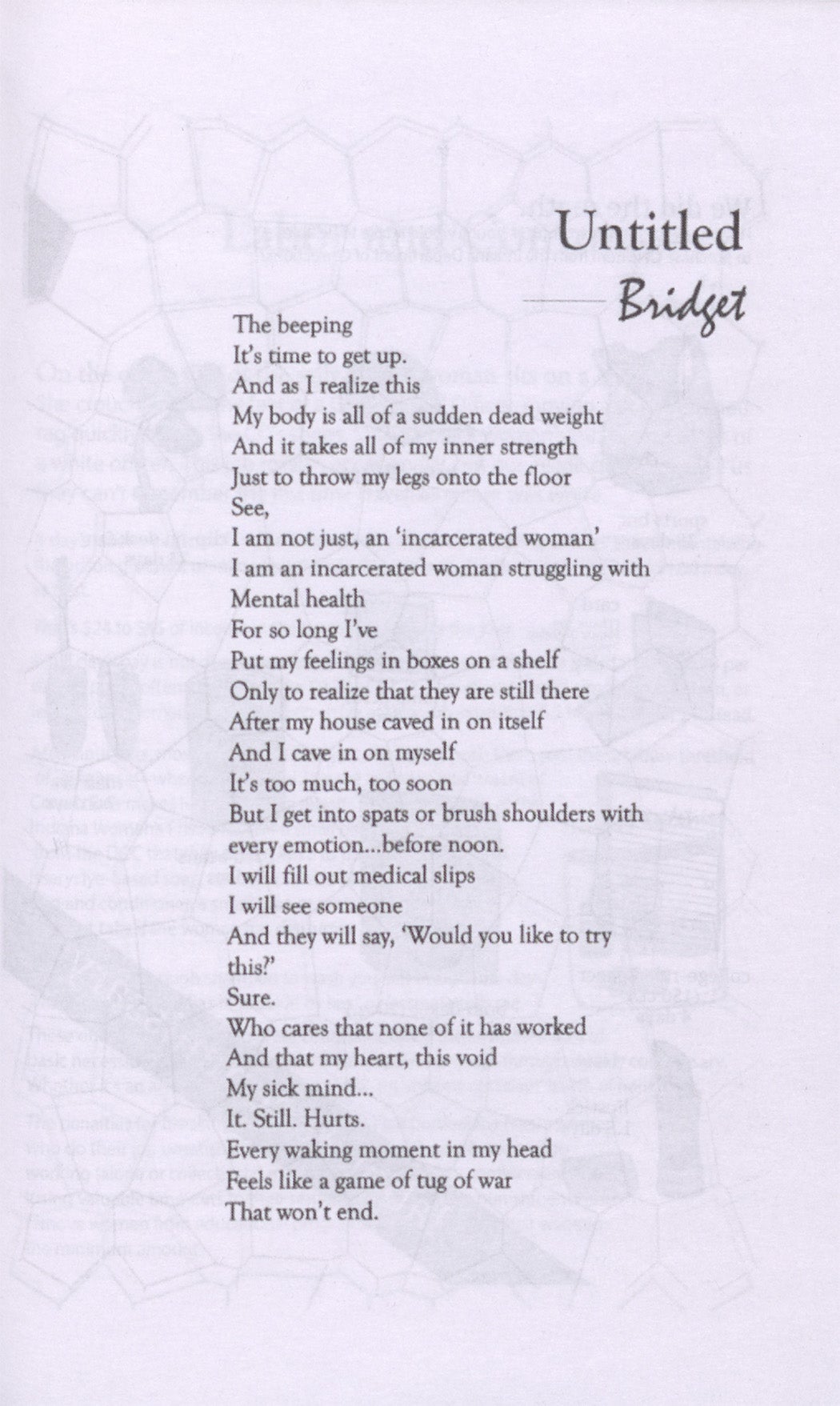 The next poem is Bridget’s account of her struggle with mental health while being incarcerated. Despite the fact that jails and prisons are the largest providers of mental health treatment in the United States, the number of people predicted to have mental health issues vastly exceeds the number of people in prison actually receiving mental health care.