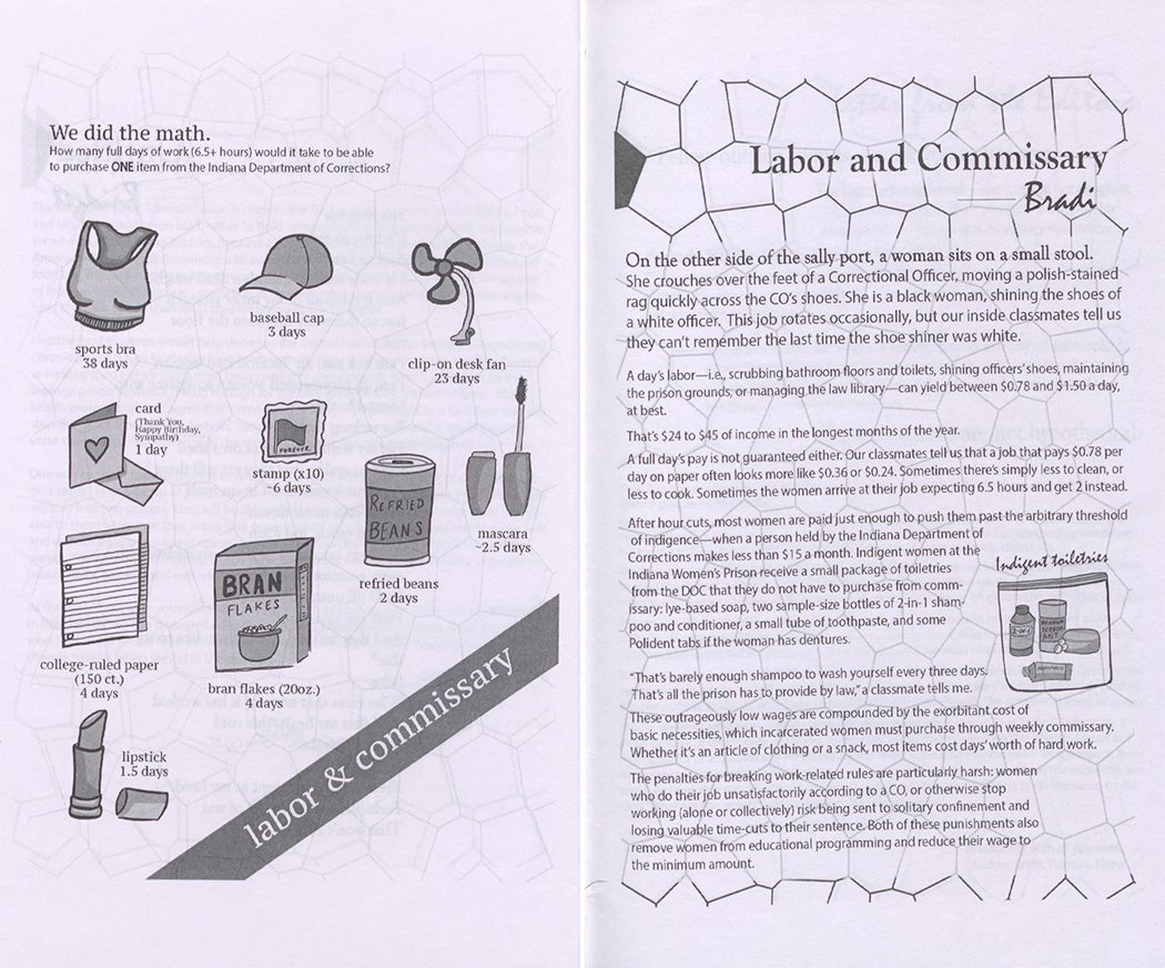 How many days of full-time work at the prison wage would it take to be able to buy a can of beans or a sports bra off commissary? The women not only did the math but illustrated it. Bradi’s essay “Labor and Commissary” on the next page goes into detail about how already-low wages are cut further so that most women live on $24-$45 per month, just above Indiana’s threshold for indigence. The forced nature of work—in that if someone does not work, they are punished by being sent to solitary confinement is also explicitly stated.