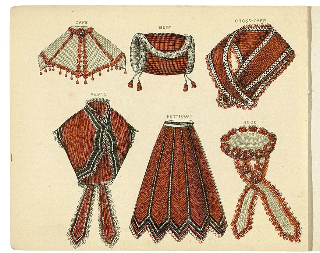 There is so much that these volumes shed on nineteenth century social and cultural history. To pick out just a few. They give us a glimpse into how women worked from the home and utilized their skills to provide additional income. They provide lists of places where women could sell their knitted items and so provide a rich picture of shops and the importance of the fancy wool trade at this time. A review in “ The Queen,” from 4 November 1883 reproduced in Dorinda’s Needlework for Ladies, for Pleasure and Profit (1886) provides an example: “One of the features of the manual is a detailed list of useful books on needlework and of work societies, which will prove a guide to would-be workers, always in quest of some channel for their productions.”