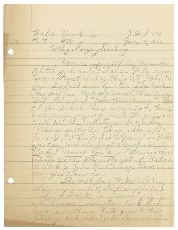 “Once upon a time” begins an essay that Baker saved for forty-five years. The words were handwritten in pencil by a junior high school student named Katie Hawkins in 1953. The story was about “a little girl called Katie. Katie never took interest in anything,” until one day Katie passed by the neighborhood library and “said to herself, ‘I think I will go in.’” There she found a history book.