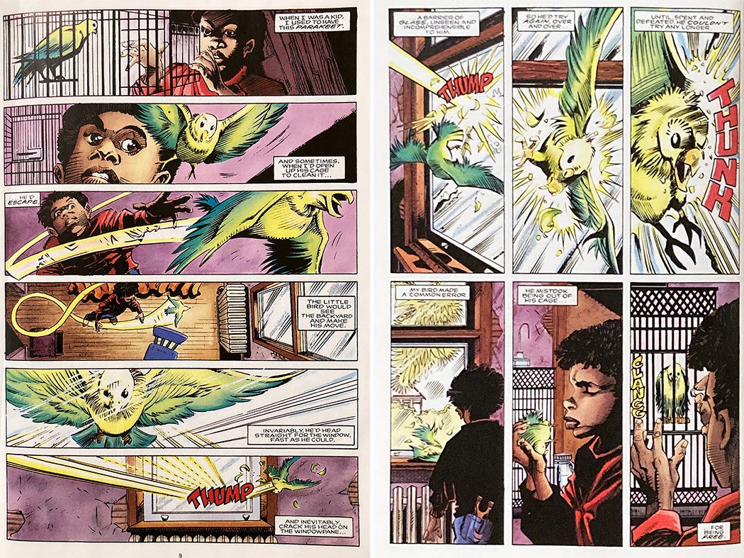 The first two pages of Hardware feature a set of wide and then long panels that flash between a young Metcalf and his caged pet parakeet. The bird escapes, eyes the backyard through a closed window, and tries to fly out, but “[. . .] inevitably,” the fictional Metcalf notes, “[he’d] crack his head on the windowpane.” Cowan employs an alternating close-up between the parakeet repeatedly hitting its head and Metcalf somberly scooping up the bird and caging it. “My bird made a common error,” Metcalf says. “He mistook being out of his cage for being free.” While Metcalf’s genius provides him with opportunities, his Blackness keeps him forever imprisoned.