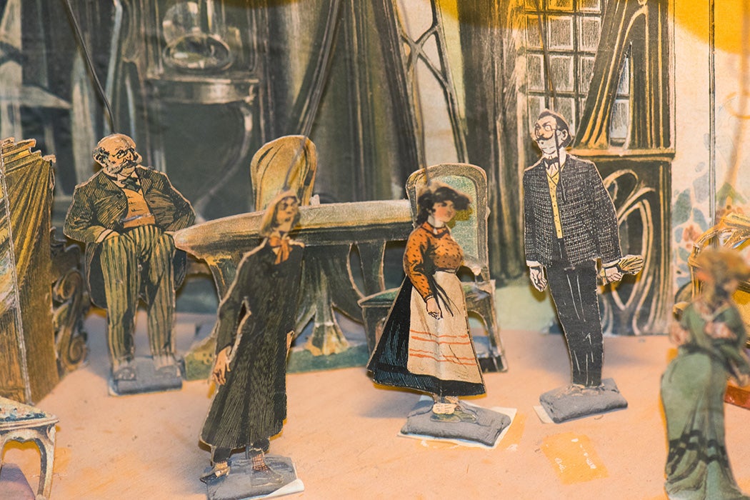 Clearly, people were hungry for entertainment. And in this time before Netflix and YouTube, enterprising toymakers developed a novel way to bring entertainment into the home: paper theaters. For “one penny plain, two cents colored,” you got a tiny cardboard stage about the size of a paperback book, complete with a proscenium arch, curtains, and sometimes even a paper audience. The characters were laid out on sheets of paper, frozen in dramatic poses: villains brandish revolvers capped with clouds of gunpowder, jolly sailors hook arms and dance, clowns emerge from barrels.