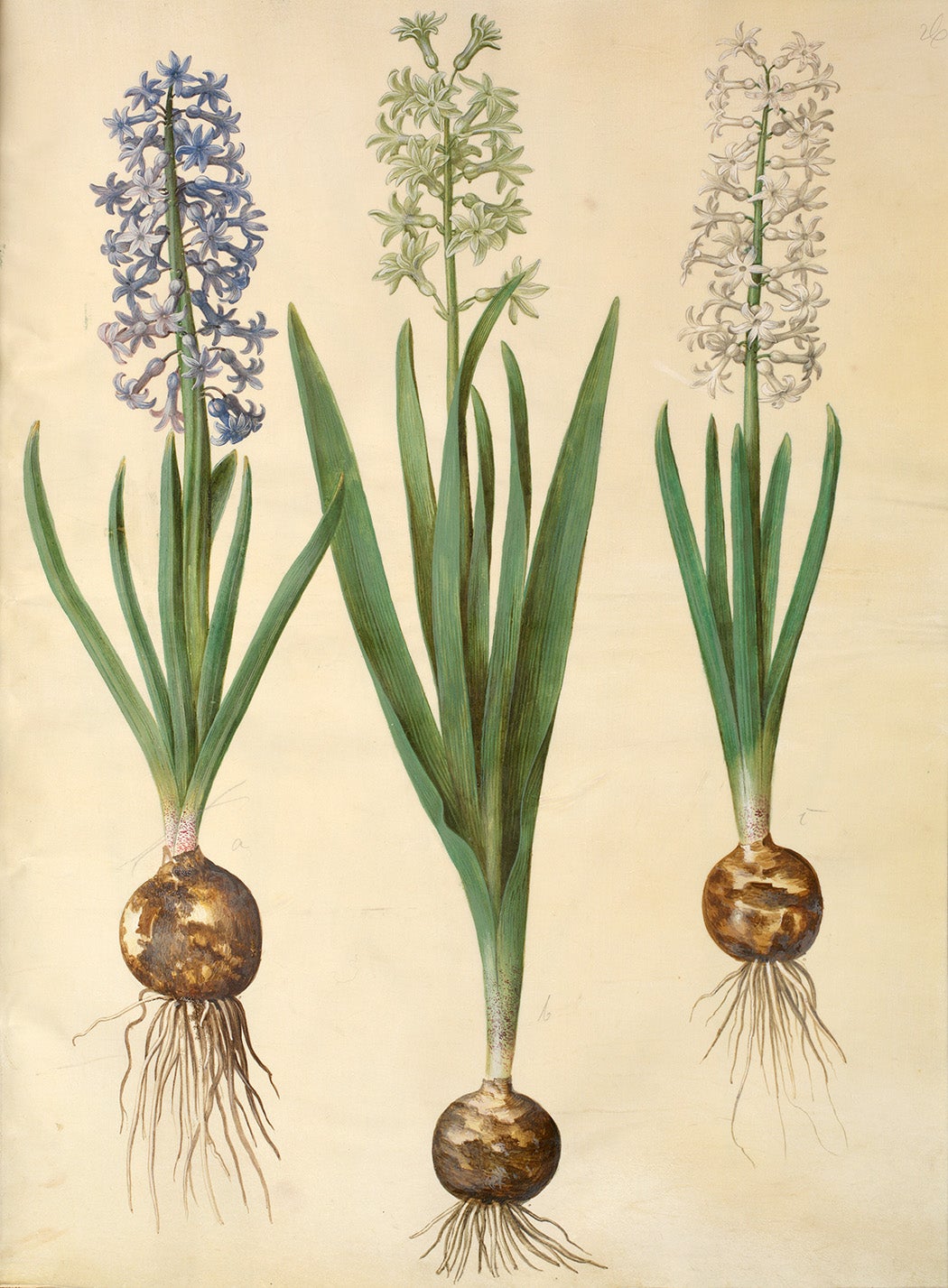 This stunning image above of three garden hyacinths provides an apt introduction to the plant, from flowers to roots. Significantly, the artist carefully defined the hyacinths’ irregular globe-shaped bulbs with bronze-colored papery tunics. Such tunicate bulbs are fleshy stems that store nutrients absorbed by the plant during its periods of growth. Once the plant enters the dormant stage that coincides with the arrival of wintery weather conditions, the bulb provides enough water and energy for the plant to survive until the spring, when warm temperatures and more concentrated sunlight trigger and fuel the plant to grow once again.