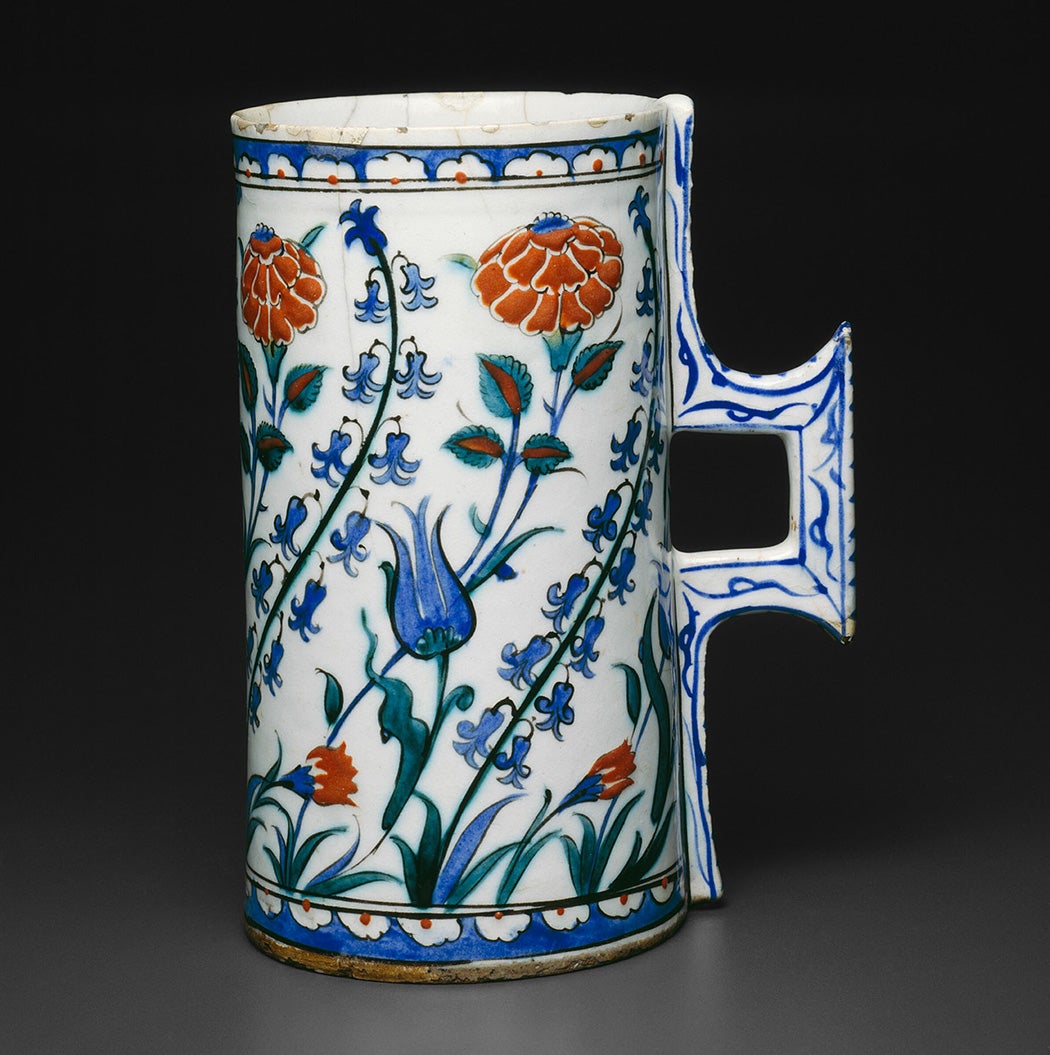 Bulb adaptations enabled the hyacinth to survive in its native eastern Mediterranean despite the short growing season, and this proved invaluable to humans. Merchants active in Istanbul from the 1500s to the mid-1700s prospered, as an economic study explains, by selling easily-transportable bulbs through inter- and transregional trade networks. In the Ottoman Empire, the hyacinth held special status as did tulips, carnations, and roses, owing to centuries of their cultivation. While real Ottoman hyacinths do not survive today, their once-vibrant cultural presence is immortalized in the floral motifs decorating such objects as this Iznik tankard below.
