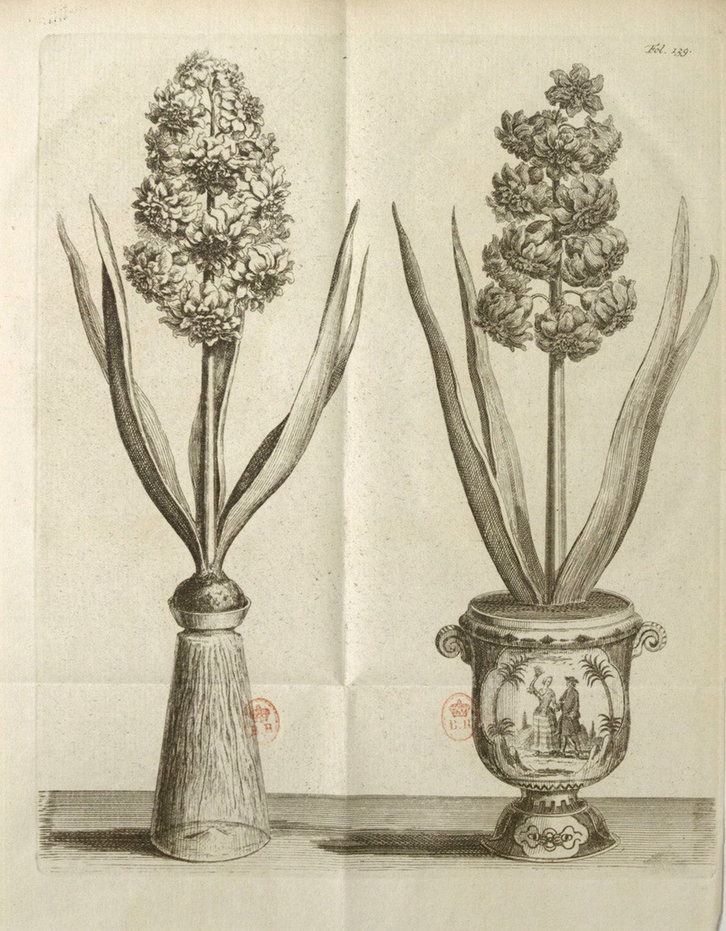 The ease of forcing hyacinth bulbs to flower indoors helped to spark a mania for the plant in eighteenth-century France. In the mid-1740s, Madame de Pompadour, the mistress of Louis XV, popularized the process of forcing bulbs to bloom indoors at the French court. It was also likely Madame de Pompadour who first ordered the French royal porcelain manufacturer Sèvres to begin producing bulb pots for forcing. While one can force hyacinth bulbs by planting them in a glass vase above water or in a pot with soil, as this illustration shows, the use of glass affords the double pleasures of observing the plant grow a flower stock and roots.