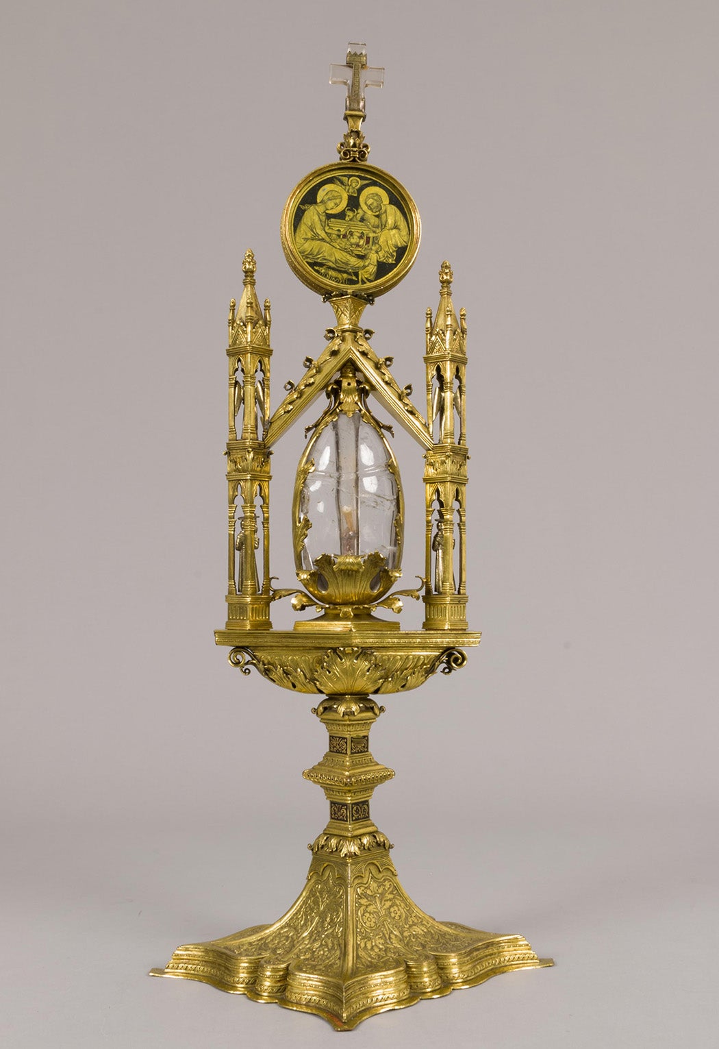 Reliquaries, the containers that house relics, took on many forms throughout the Middle Ages and were often crafted in homage to the martyr whose remains were within. Some were ornate caskets depicting images of the saint’s life or martyrdom, while others were crafted as busts of the saints or ornate works of glass and metal to display larger, more intact relics, such as bones.