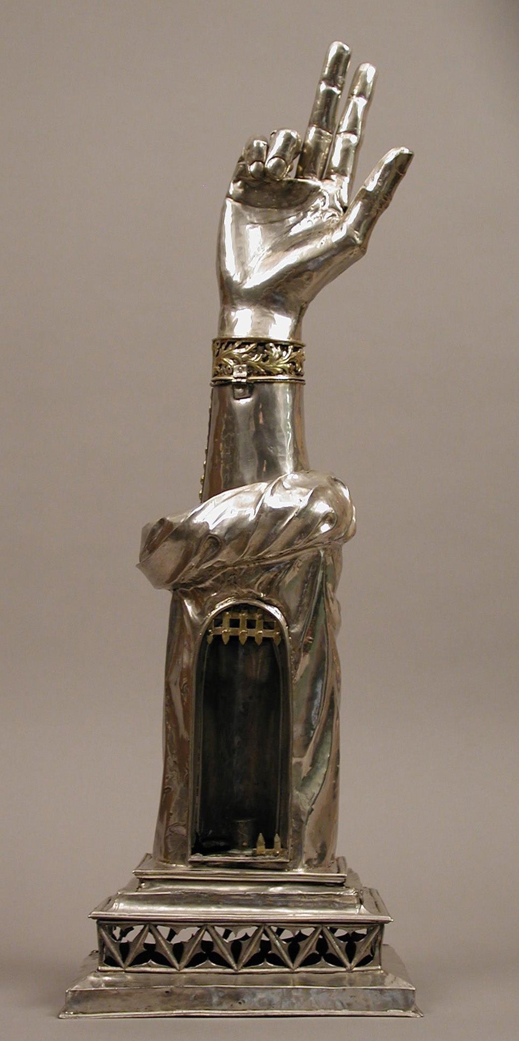 An interesting phenomenon in reliquary art are those shaped like parts of the human body. These gained popularity in the West in the twelfth and thirteenth centuries, and were known as “speaking reliquaries.” According to Bynum and Gerson, this implies “that the shape expresses or ‘speaks’ the body part beneath; yet we have much evidence that many body-part reliquaries did not in fact contain the bone or body part depicted.” Instead, they were often representative of the underlying ritual associated with the relic. For instance, a reliquary in the shape of an arm could signify the blessing given by the priest or bishop. And, by the late Middle Ages, reliquaries in the West didn’t contain body parts at all, but instead usually included contact relics, such as bits of clothes or shoes.