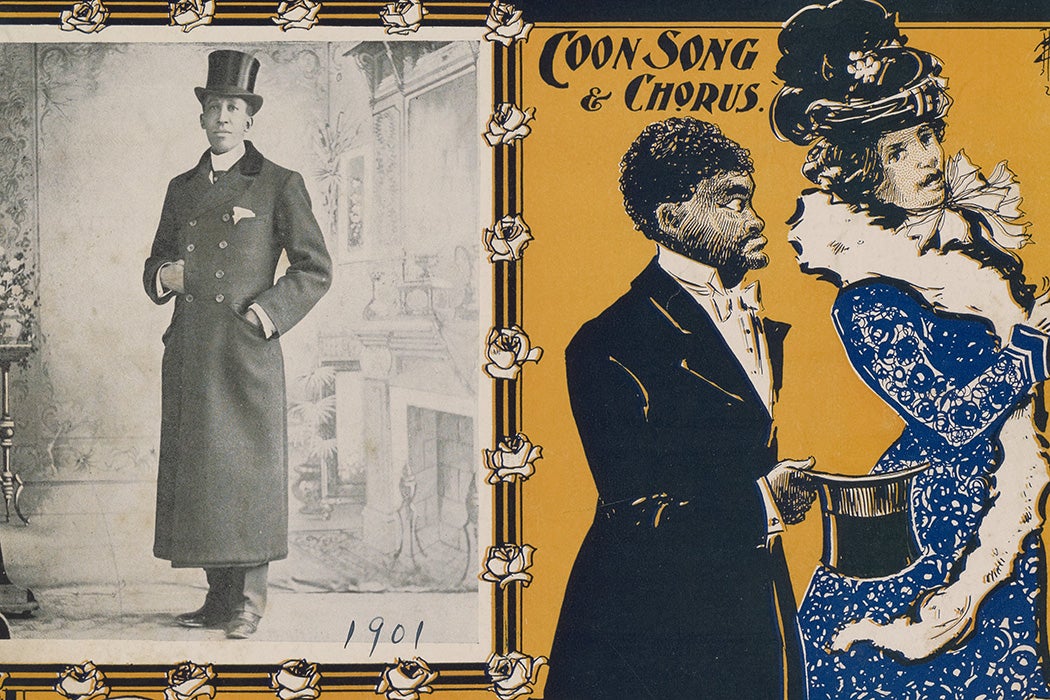 The Black creatives who hung out at the Marshall were defining an urban performance style that loosed them from the idealized plantation pastorals that blackface minstrelsy had made popular. Ernest Hogan, Bert Williams, George Walker, Bob Cole, and Billy Johnson all began their careers performing in blackface: Black men, painting their faces Black to transform into the White idea of bumbling, stumbling, comedic, rural caricatures. In the 1890s, a new type of character began filling the song-sheets and stages, that of the urban, dangerous, dapper Black man who wore the sharpest suits and carried even sharper switchblades. This new character reflected the lived realities of Black people who migrated to northern centers as post-Reconstruction refugees, as famously described in Paul Laurence Dunbar’s The Sport of the Gods, but also played deeply into already existing stereotypes about Black men as violent, lecherous, and outside the law. The songs and musicals of what is known as the “coon song craze” produced pieces so intensely popular that they enshrined the performers as the biggest celebrities of their day. The craze also marked a moment when White social consciousness grasped onto an idea of dangerous and alluring urban Blackness that has been encoded in popular American culture ever since.